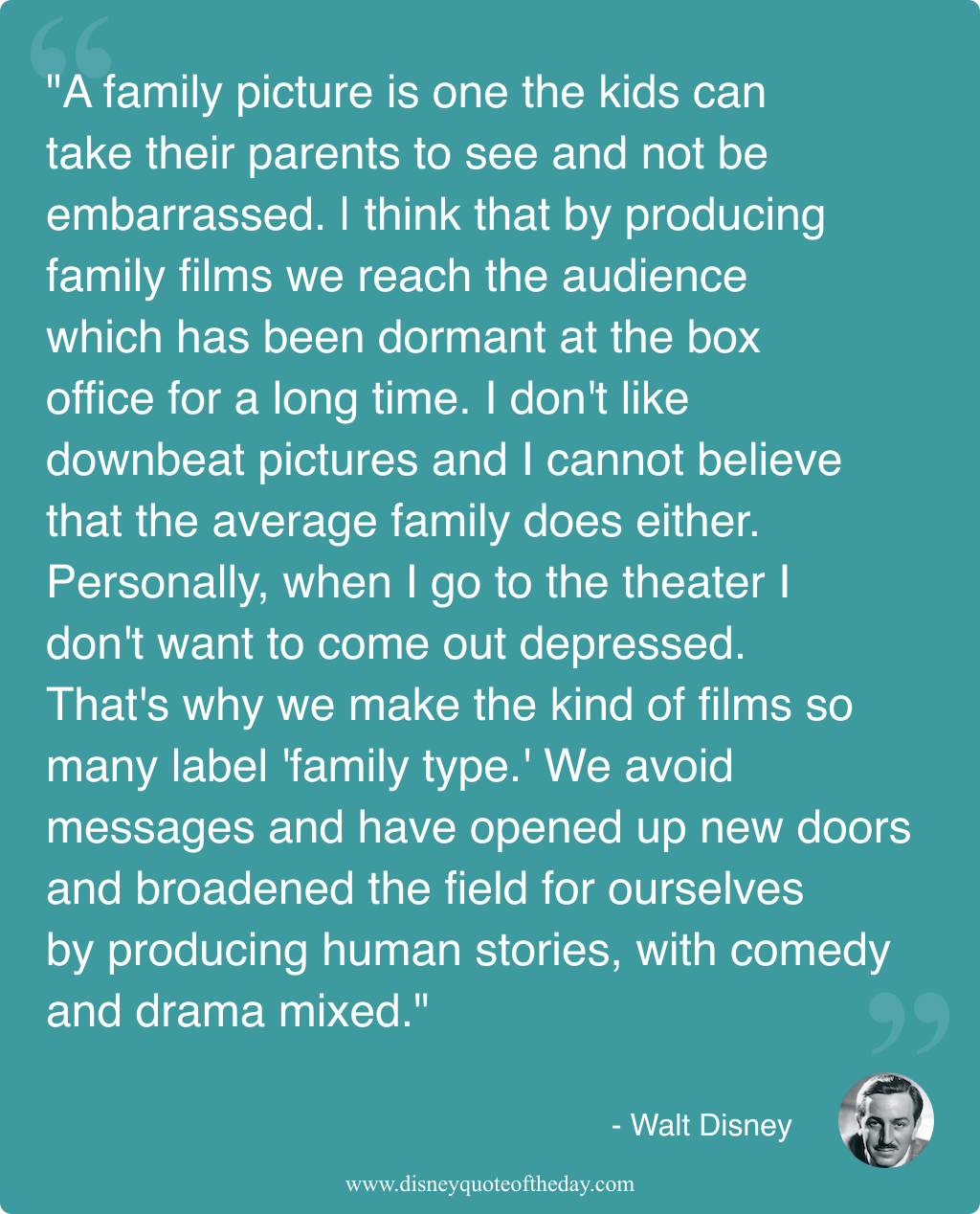 A family picture is one the kids can take their parents to see and not be embarrassed. | think that by producing family films we reach the audience which has been dormant at the box office for a long time. I don't like downbeat pictures and I cannot believe that the average family does either. Personally, when I go to the theater I don't want to come out depressed. That's why we make the kind of films so many label 'family type.' We avoid messages and have opened up new doors and broadened the field for ourselves by producing human stories, with comedy and drama mixed.